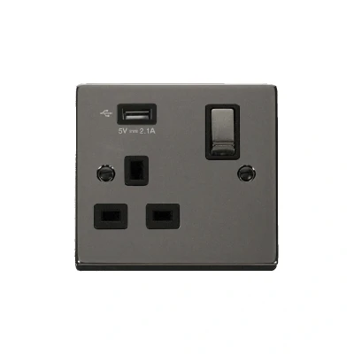 Click Deco 13A Ingot 1G Switched Socket With Single 2.1A USB Outlet Black Nickel Insert Black