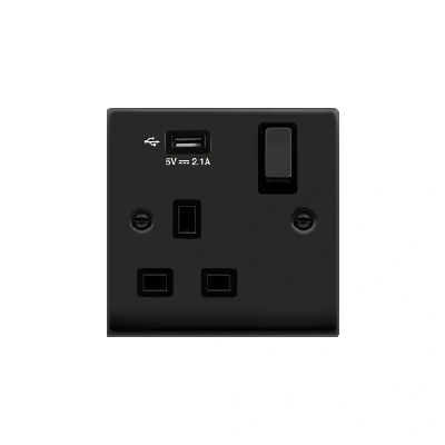 Click Deco 13A Ingot 1G Switched Socket With Single 2.1A USB Outlet Matt Black Insert Black