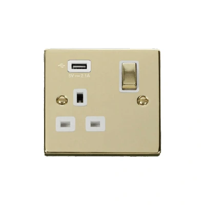 Click Deco 13A Ingot 1G Switched Socket With Single 2.1A USB Outlet Polished Brass Insert White