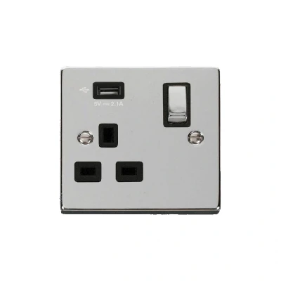 Click Deco 13A Ingot 1G Switched Socket With Single 2.1A USB Outlet Polished Chrome Insert Black