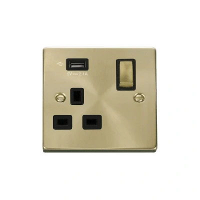 Click Deco 13A Ingot 1G Switched Socket With Single 2.1A USB Outlet Satin Brass Insert Black