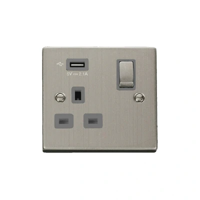 Click Deco 13A Ingot 1G Switched Socket With Single 2.1A USB Outlet Stainless Steel Insert Grey