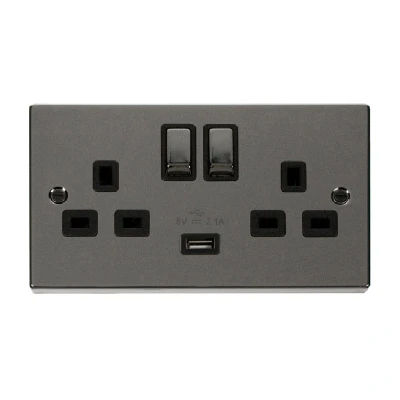 Click Deco 13A Ingot 2G Switched Socket With Single 2.1A USB Outlet Black Nickel Insert Black