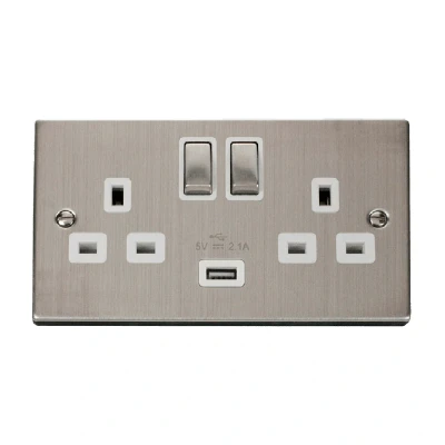 Click Deco 13A Ingot 2G Switched Socket With Single 2.1A USB Outlet Stainless Steel Insert White