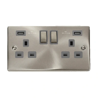 Click Deco 13A Ingot 2G Switched Socket With Twin USB 4.2A Outlets Satin Chrome Insert Grey