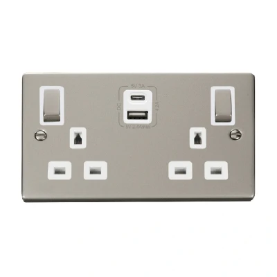 Click Deco 13A Ingot 2G Switched Socket With Type A & C USB 4.2A Outlets Pearl Nickel Insert White