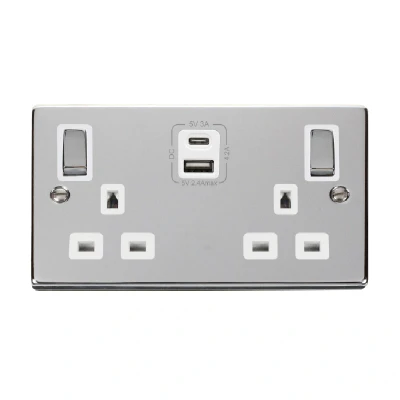 Click Deco 13A Ingot 2G Switched Socket With Type A & C USB 4.2A Outlets Polished Chrome Insert White