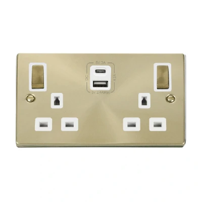 Click Deco 13A Ingot 2G Switched Socket With Type A & C USB 4.2A Outlets Satin Brass Insert White
