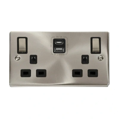 Click Deco 13A Ingot 2G Switched Socket With Type A & C USB 4.2A Outlets Satin Chrome Insert Black