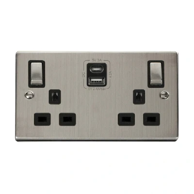 Click Deco 13A Ingot 2G Switched Socket With Type A & C USB 4.2A Outlets Stainless Steel Insert Black