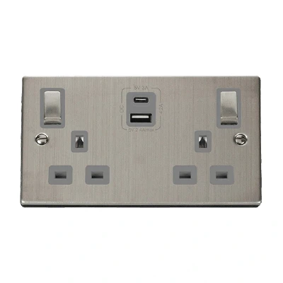 Click Deco 13A Ingot 2G Switched Socket With Type A & C USB 4.2A Outlets Stainless Steel Insert Grey