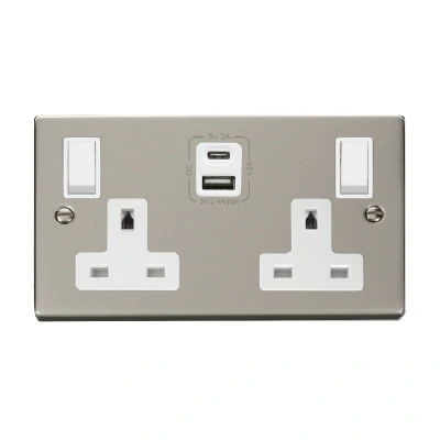 Click Deco 2G 13A Switched Socket With Type A & C USB 4.2A Outlets Pearl Nickel Insert White