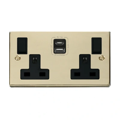 Click Deco 2G 13A Switched Socket With Type A & C USB 4.2A Outlets Polished Brass Insert Black