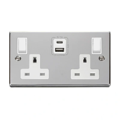 Click Deco 2G 13A Switched Socket With Type A & C USB 4.2A Outlets Polished Chrome Insert White