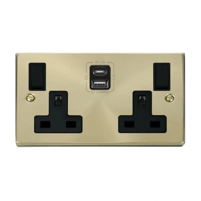 Click Deco 2G 13A Switched Socket With Type A & C USB 4.2A Outlets Satin Brass Insert Black