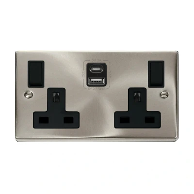 Click Deco 2G 13A Switched Socket With Type A & C USB 4.2A Outlets Satin Chrome Insert Black