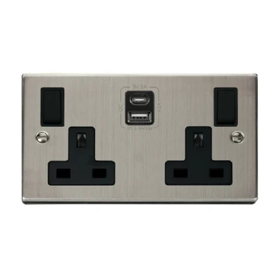 Click Deco 2G 13A Switched Socket With Type A & C USB 4.2A Outlets Stainless Steel Insert Black
