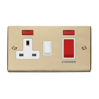 Click Deco 45A DP Switch with 13A Switched Socket and Neons Polished Brass Insert White