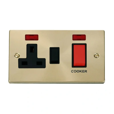 Click Deco 45A DP Switch with 13A Switched Socket and Neons Satin Brass Insert Black