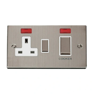 Click Deco 45A Ingot DP Switch with 13A Switched Socket and Neons Stainless Steel Insert White