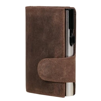 The Clicksafe wallets are the innovative mini wallets with the patented click system. One click on the side button and the credit cards slide out of the wallet. The RFID protected safe can hold up to 8 cards and are safe from bending, breaking and reading data. In addition, the wallet has a coin compartment, a note compartment and another compartment for tap and go cards such as tickets. The credit card holder is made of high-quality genuine leather (oiled Hunter leather). Due to the small dimensions of approx. 6.5 cm x 10 cm x 2.5 cm, the purse fits easily in your pocket Clicksafe – design combined with great use. Protect not only your money, but also your privacy.