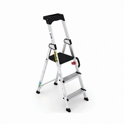 3 tread step ladder with carry handle. Light and practical aluminium frame with a glass fibre reinforced polypropylene platform. 100mm wide treads with serrated surface to prevent slips. Multifunctional tool tray. Non-slip feet. Platform Height: 670mm.