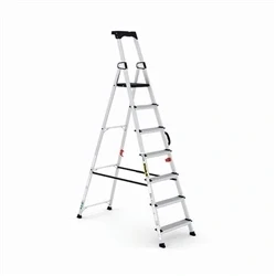 7 tread step ladder with carry handle. Light and practical aluminium frame with a glass fibre reinforced polypropylene platform. 100mm wide treads with serrated surface to prevent slips. Multifunctional tool tray. Non-slip feet. Platform Height: 1710mm.