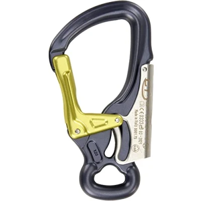 Double lever carabiner in hot forged light alloy, ideal as longes terminals for via ferrata or for adventure park. Ergonomic shape, optimal grip and opening system that allows one-handed coupling and releasing. Double lever automatic closing, extremely fast and secure; Wide opening for attaching large diameter cables; Catch-free closure prevents accidental snag during use.