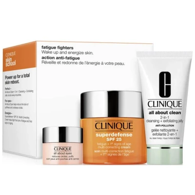 #html-body [data-pb-style=TV0UQ9G]{justify-content:flex-start;display:flex;flex-direction:column;background-position:left top;background-size:cover;background-repeat:no-repeat no-repeat;background-attachment:scroll}Wake up and energise skin! This unique Fatigue Fighters Skin Care Set is suitable for All skin types. The Set helps to ease the signs of ageing. It provides 12 hours of powerful support that reduces wrinkles, dullness, fine lines, and uneven texture. Stop Signs Technology protects the skin against aggressors that can fatigue the skin. The cream also provides antioxidants and Vitamin E for a further level of defence. What It Does• Perfect – All About Clean™ 2-in-1 Cleansing + Exfoliating Jelly scrubs away impurities.• Energize – Superdefense SPF 25 Multi-Correcting Cream helps fight the look of fatigue and first signs of aging.• For eyes – All About Eyes™ helps reduce the look of puffiness and undereye circles.Set Includes:All About Clean™ 2-in-1 Cleansing + Exfoliating Jelly, 30mlSuperdefense SPF 25 Multi-Correcting Cream 50mlAll About Eyes™ 5ml