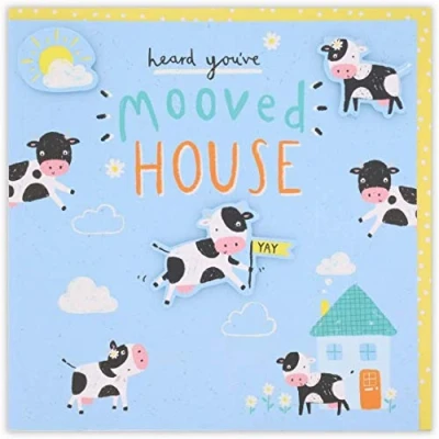 All Over Cows Card provided with a suitable sized envelope Make every greeting card great by choosing a Clintons card Cover Message: Heard you've Mooved House yay Inside Message: Congrats Yay