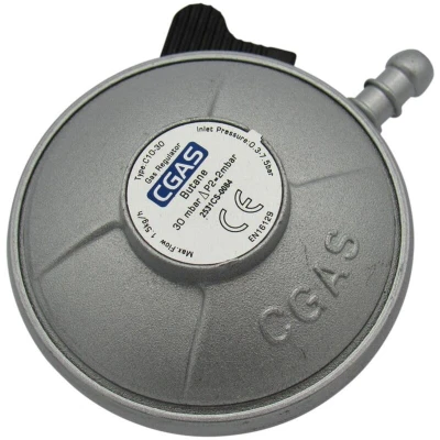 General description Our Clip On Butane Gas Regulator is designed for easy attachment to butane gas tanks with a 20mm clip-on valve. It features a hose nozzle that fits a standard 8mm gas hose, making it ideal for various applications such as camping, gas cookers, BBQs, and patio heaters. Simply clip it onto the cylinder, turn the switch to secure, and you're ready to go! Technical specifications Inlet Connection: G52 Inlet Pressure: 28 - 30 mBar Outlet Connection: H50 Outlet Pressure: 30 mBar Capacity: 1.5 KG/H Hose Nozzle: 8MM Gas Type: Butane Working Temperature: 0°C - 50°C Length: 75MM Width: 65MM Product Weight: 0.308kg Product Code: SFZZNCGRC1030 Compatibility and accessories The clip-on regulator can be fitted onto any butane cylinder equipped with an automatic valve.