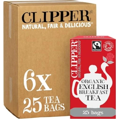 Clipper English Breakfast tea, Organic: 6 x boxes of 25 individually wrapped black tea bags (150), featuring a majestic blend of full-bodied Assam and delicate Ceylon for a refreshing finish Fairtrade tea bags: Clipper tea is organically grown in the rich red soils of Africa and the fertile soils of India, for a full, distinct flavour. 1 tea bag makes 1 cup of tea The perfect cup every morning: Delicious breakfast tea bags, afternoon tea or for after dinner. Full of flavour, our non-bleached teabags are fully compostable and biodegradable after your brew Natural, organic tea, just the way it should be: We fill our plastic-free tea bags with organic ingredients (good-bye pesticides, hello wildlife) and always do the best we can for the environment Enjoy a Clipper cuppa: Luxury tea bags, tea gift sets, loose leaf teas, tea bags with string and tag or flavour infusions - we source the best quality fine teas, so every cup you drink is special