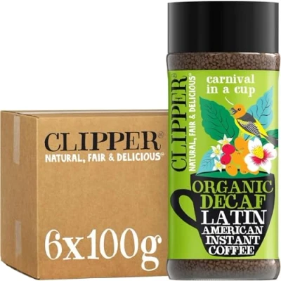 Clipper coffee: 600g (6x100g jars) of Latin American organic instant decaf coffee granules. A joyfully toasty, pure indulgence blend of smooth Arabica decaf coffee, organically decaffeinated using CO2 Premium organic coffee: Fairtrade instant coffee with clean finish and rich aroma. Our super special decaffeinated Arabica coffee blend, made from non-GM soil-association approved organic ingredients Fairtrade Clipper coffee: Instant decaf coffee without the hassle of using a French press, coffee machine or cafetiere. Boil fresh water, leave to cool for a minute, then pour over de-caffeine coffee For at home, office, parties or a gift: This coffee multi pack is great for home or catering. Sip your favourite hot drink with the reassurance that, at Clipper, we do our best for the environment Enjoy a Clipper cuppa: Discover the Clipper collection of luxury coffee, Clipper coffee gifts for coffee lovers, fine tea bags and flavoured teas. We source the best quality, so every cup is special