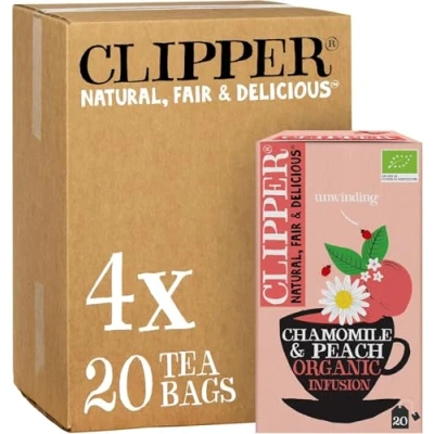 Clipper Organic Chamomile and Peach Infusions Fruit Teabags, 80 Tea Bags (4x Boxes of 20), Caffeine Free Herbal Tea, Natural, Unbleached, Plastic