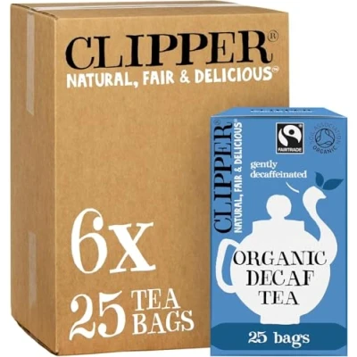 Clipper Decaffeinated tea bags: 6 x boxes of 25 black decaf teabags (150), de-caffeinated the natural way. A fine organic Assam tea, specially selected to retain a full flavour after decaffeination Fairtrade tea bags, decaf blend: Clipper tea is organically grown in the rich red soils of Africa and the fertile soils of India, for a full, distinct flavour. 1 bag makes 1 cup of tea The perfect every day tea bags: Delicious breakfast tea bags, afternoon tea or for after dinner, which is naturally caffeine free. Full of flavour, our non-bleached teabags are fully compostable and biodegradable after your brew Natural, organic tea, just the way it should be: We fill our plastic-free tea bags with organic ingredients (good-bye pesticides, hello wildlife) and always do the best we can for the environment Enjoy a Clipper cuppa: Luxury tea bags, tea gift sets, loose leaf teas, tea bags with string and tag or flavour infusions - we source the best quality fine teas, so every cup you drink is special
