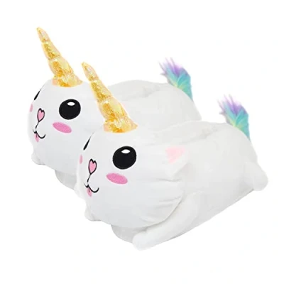 CATCORN is a creative cross of cat and unicorn. A fantastic animal creature that now keeps your feet warm and looks so cute. Made from fluffy material and thick soles, the shoe keeps the cold off your feet. Kawaii – The catcorn has a cute face with pink biscuit and a heart nose. The slippers are a great gift for women, teenagers and bronies. Non-slip – The sole is 2 cm thick and thus keeps the cold off the ground and cushions steps. The slippers are also non-slip thanks to the nubs. You can move around with the plush shoes or sit comfortably on the couch. Design – The horn of the catcorn shimmers in a glittering gold. The tail is in beautiful rainbow colours. The slippers are an exclusive production of close up. Material and size: cuddly, warm plush quality made from 100% polyester. One size for adults, suitable for size 8-10, sole approx. 30 cm long.