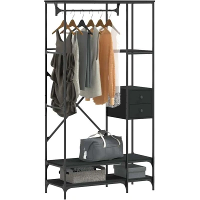 ManoManoGeneral description Clean up your closet and easily pick out your outfit with this stylish and compact clothes rack. Made from durable engineered wood and a sturdy metal frame, it offers exceptional quality and stability, making it perfect for organizing your clothes and bags. Technical specifications Colour: Black Material: Engineered wood, metal Dimensions: 97 x 40 x 180 cm (L x W x H) Assembly required: Yes Usage Ample storage space for organizing clothes and bags. Upper shelf for boxes and folded clothes. Lower shelf for shoes. Hanging rod for longer outfits. Drawers for underwear storage. Other information Warning: To prevent tipping, use the provided wall attachment device. Screws and plugs for wall attachment are not included; use suitable screws and plugs for your walls. Please read and follow the assembly instructions carefully.