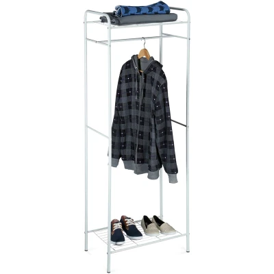 General description The Relaxdays Clothes Stand with Shelves from the SANDRA collection is the perfect storage solution for your hallway. This versatile wardrobe coat rack features a garment rail and two shelves, providing ample space for hanging and storing your clothing and accessories. Technical specifications Total size: approx 166 x 60.5 x 38 cm Weight: approx 3.5 kg Material: powder-coated steel pipes Distance between shelves: approx 144 cm Max. capacity per shelf: approx 10 kg Distance between floor and bottom shelf: approx 12 cm Garment rail length: approx 60 cm Garment rail capacity: approx 15 kg Space for about 6 pairs of shoes Usage Garment rail is ideal for hanging jackets, coats, and shirts. Top shelf can be used for storing hats and scarves. Bottom shelf serves as a shoe rack suitable for boots and other taller shoes. Other information Available in multiple colors: white, black, and honey brown. Rubber caps on feet protect your floors. Included in delivery: Clothes stand