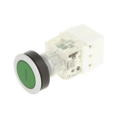 'Club push button Silver with momentary cap in Green and I symbol Installation opening diameter of 22,3 mm and flat front frame height of 2 mm Push button contact Geber with 2 N/O Contact, designed for 250 V/6 A Connection Type: Screw connection with a cross section can withstand a weight of up to 2.5 mm² IP protection rating: IP 65