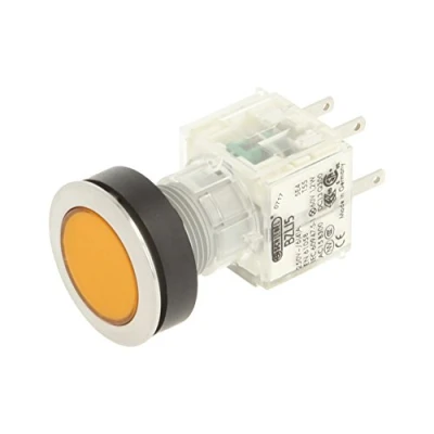 Club push button Stainless Steel with momentary cap in yellow Installation opening diameter of 22,3 mm and flat front frame height of 2 mm Beleuchteter tast contact transmitter with 1 N/O Contact, designed for 250 V/6 A and a 24 V LED Connection Type: Single Flat Connector 2.8 mm x 0.8 mm IP protection rating: IP 65