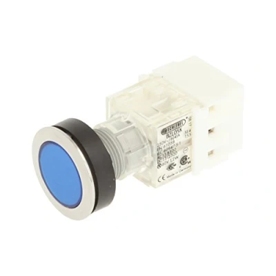 Club push button Stainless Steel with momentary cap in blue Installation opening diameter of 22,3 mm and flat front frame height of 2 mm Illuminated key feedback CONTACT Geber with 1 opener, 250 V/6 A and a 24 V LED Connection Type: Screw connection with a cross section can withstand a weight of up to 2.5 mm² IP protection rating: IP 65