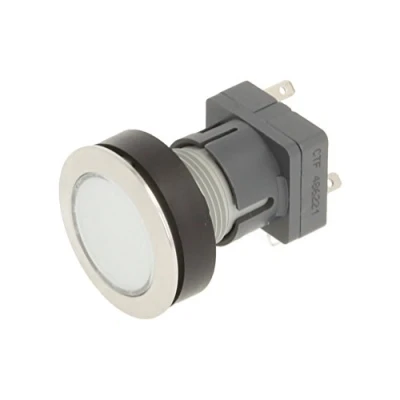 Club push button Stainless Steel with momentary cap in clear Installation opening diameter of 22,3 mm and flat front frame height of 2 mm Tast contact transmitter with 1 Changer, 48 V/120mA Connection Type: Single Flat Connector 2.8 mm x 0.8 mm IP protection rating: IP 65