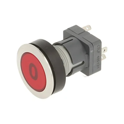 'Club push button Stainless Steel with button cap in red and 0 symbol Installation opening diameter of 22,3 mm and flat front frame height of 2 mm Lighted tast contact transmitter with 1 Changer, 48 V/120mA and a 24 V LED Connection Type: Single Flat Connector 2.8 mm x 0.8 mm IP protection rating: IP 65