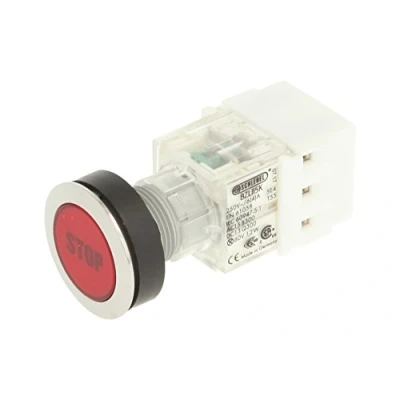 'Club push button Stainless Steel with button cap in red and stop symbol Installation opening diameter of 22,3 mm and flat front frame height of 2 mm Illuminated Push Button Contact Geber with 2 N/O Contact, designed for 250 V/6 A and a 24 V LED Connection Type: Screw connection with a cross section can withstand a weight of up to 2.5 mm² IP protection rating: IP 65