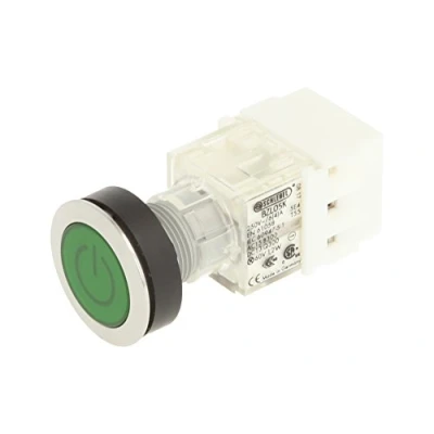'Club push button Stainless Steel with momentary cap in Green and start/stop symbol Installation opening diameter of 22,3 mm and flat front frame height of 2 mm Illuminated key feedback CONTACT Geber with 1 opener, 250 V/6 A and a 24 V LED Connection Type: Screw connection with a cross section can withstand a weight of up to 2.5 mm² IP protection rating: IP 65
