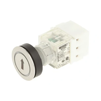 'Club push button Stainless Steel with White arrow ring lighting and laser-marking symbol " Installation opening diameter of 22,3 mm and flat front frame height of 2 mm Illuminated Push Button Contact Geber with 2 N/O Contact, designed for 250 V/6 A and a 24 V LED Connection Type: Screw connection with a cross section can withstand a weight of up to 2.5 mm² IP protection rating: IP 65