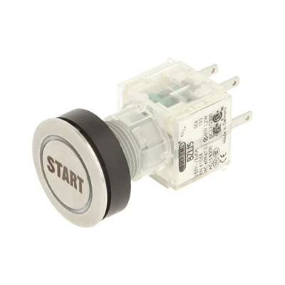 'Club push button Stainless Steel with White Ring Light & Laser marked symbol start " Installation opening diameter of 22,3 mm and flat front frame height of 2 mm Beleuchteter tast contact transmitter with 1 N/O Contact, designed for 250 V/6 A and a 24 V LED Connection Type: Single Flat Connector 2.8 mm x 0.8 mm IP protection rating: IP 65