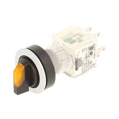 Club selector switch Silver, Yellow illuminated Toggle with 3 Tastenden, on 11, 12 and 13 clock with spring return Installation opening diameter of 22,3 mm and flat front frame height of 2 mm Illuminated Push Button Contact Geber with 2 N/O Contact, designed for 250 V/6 A and a 24 V LED Connection Type: Single Flat Connector 2.8 mm x 0.8 mm IP protection rating: IP 65