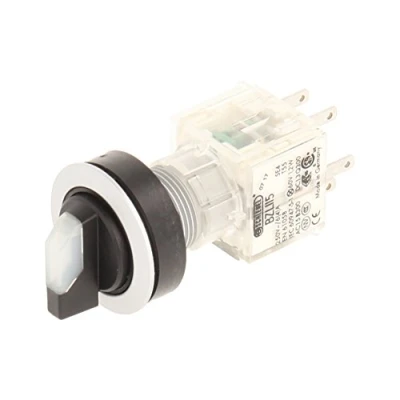 Club selector switch Silver, Clear illuminated Toggle, with 3 positions left latching and right spring, at 9, 12 and 13 with spring return Installation opening diameter of 22,3 mm and flat front frame height of 2 mm Illuminated Push Button Contact Geber with 2 N/O Contact, designed for 250 V/6 A and a 24 V LED Connection Type: Single Flat Connector 2.8 mm x 0.8 mm IP protection rating: IP 65