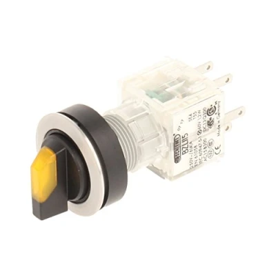 Club selector switch in stainless steel, yellow illuminated Toggle with 3 Tastenden, on 11, 12 and 13 clock with spring return Installation opening diameter of 22,3 mm and flat front frame height of 2 mm Illuminated Push Button Contact Geber with 2 N/O Contact, designed for 250 V/6 A and a 24 V LED Connection Type: Single Flat Connector 2.8 mm x 0.8 mm IP protection rating: IP 65